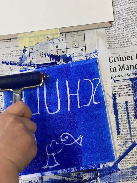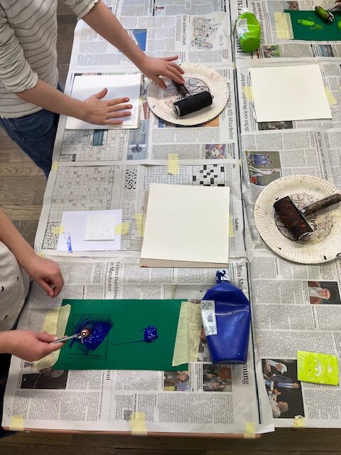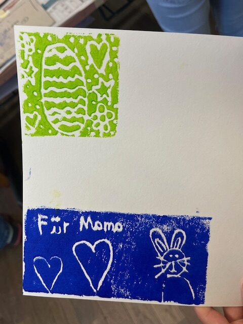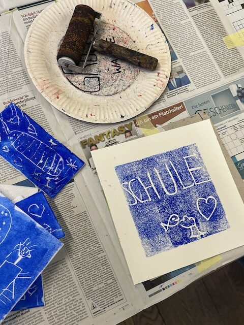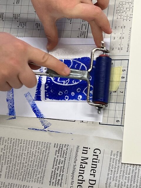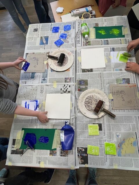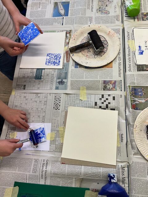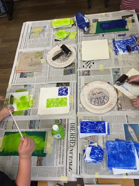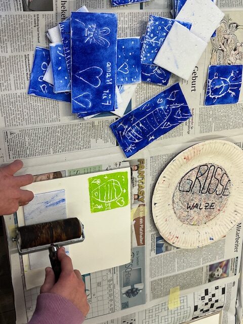Nach einer kurzen Pause konnten sie alle in Workshops selbst aktiv werden. Im sogenannten „Basis-Projekt“ erlernten die Fuchsbachschüler die Grundlagen des Linoldrucks. Hierbei fertigten sie mit viel Geschick mehrere Werkstücke in verschiedenen Größen an, die sie auch selbst einfarbig drucken durften. Dies bereitete nicht nur den Kindern, sondern auch den Lehrerinnen großen Spaß. Geduldig und engagiert unterstützte Holger Montag dabei die jungen Künstlerinnen und Künstler bei ihren ersten Druckversuchen, welche mehrheitlich zu recht ansehnlichen Ergebnissen führte.